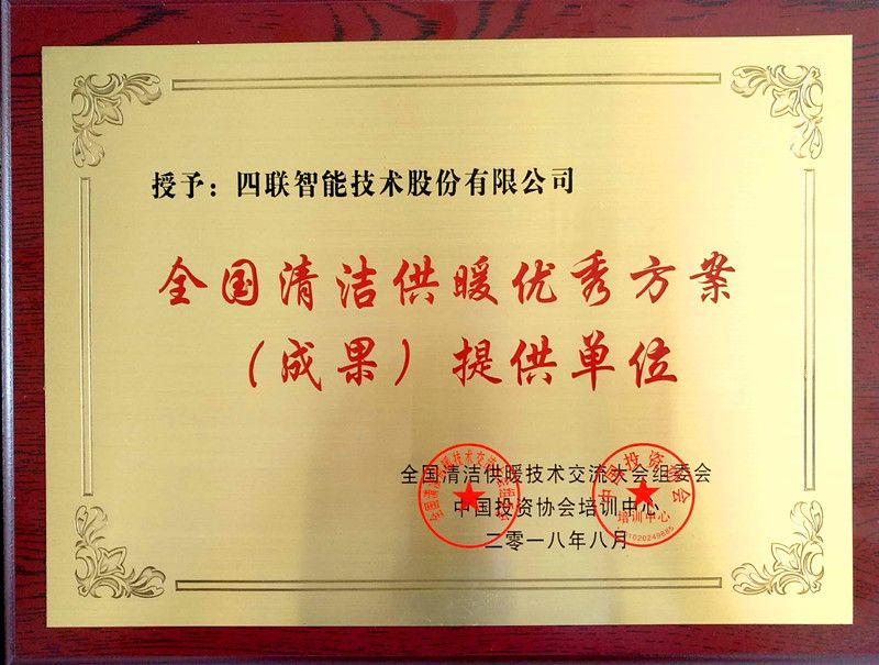 四联智能荣获“全国清洁供暖优秀方案(成果)提供单位” 荣誉称号