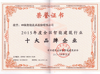 四联智能荣获“2015年度全国智能建筑行业十大品牌企业”、“2015年度全国智能建筑行业80强企业”荣誉称号。四联智能已连续多年荣获此两项殊荣。