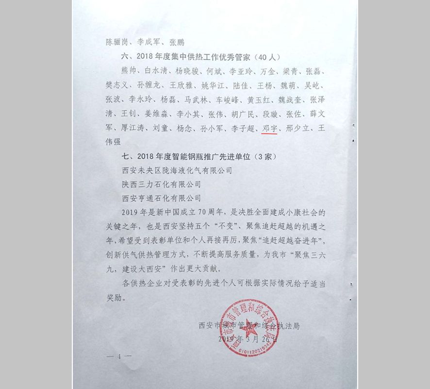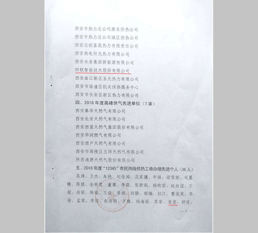 联席会议中,贾处长首先总结了2018年度的供热工作,肯定了各项供热工作的成绩,也对工作不足的地方提出了建议,希望各供热相关单位积极改进,不断提高服务质量,为我市“聚焦三六九,建设大西安”做出更大贡献。然后,为激励先进、鼓励后进,市城市管理和综合执法局表彰了西安市2018年度高峰供气集中供热先进单位14家、“12345”市民热线供热工单办理先进个人36人、集中供热工作优秀管家40人。其中,四联智能荣获“2018年度集中供热先进单位”,四联智能员工袁斐被评为“12345市民热线供热工单办理先进个人”,邓宇被评为“集中供热工作优秀管家”。