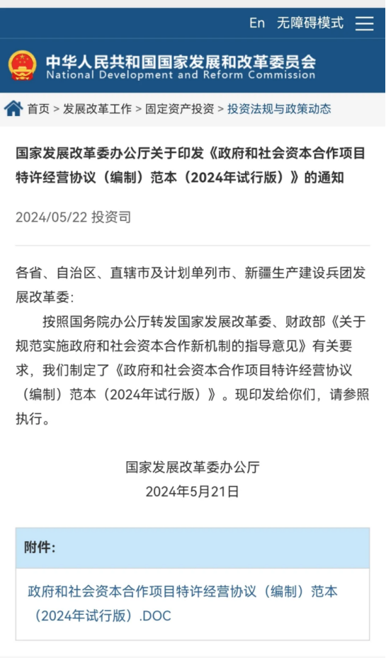5月22日,国家发展改革委办公厅印发《政府和社会资本合作项目特许经营协议(编制)范本(2024年试行版)》,指导各地方按照新机制要求依法合规、稳妥有序实施政府和社会资本合...