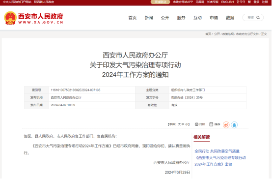 2024年4月7日,西安市人民政府网站发布重磅通知——《西安市大气污染治理专项行动2024年工作方案》(以下简称《工作方案》),明确了2024年西安大气污染治理的多项目标。《工...