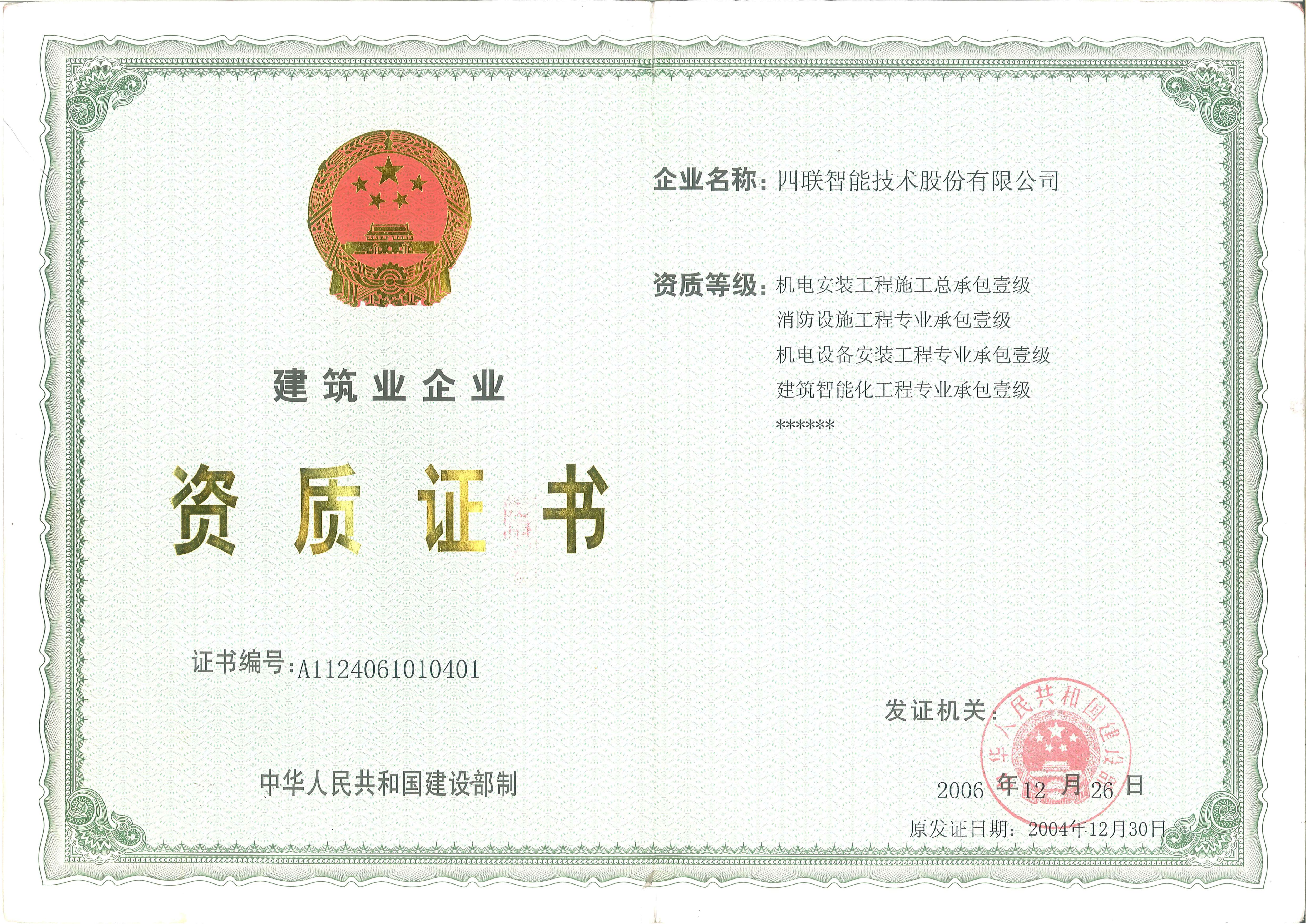10月,获得建设部颁发的机电设备安装施工总承包一级资质及消防设施工程专业承包一级资质,标志着公司由从事中央空调空调、消防、建筑智能化系统工程专业承包一级企业发展成为具有机电安装工程总承包一级资质的企业。