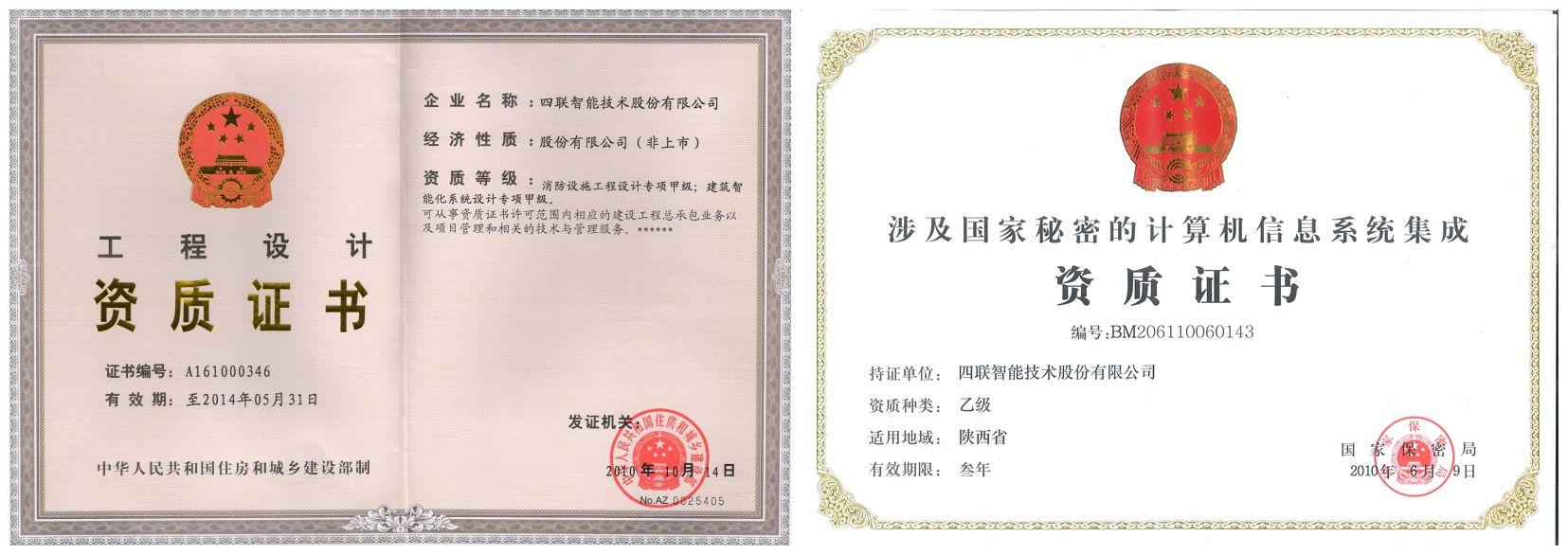 获得建设部颁发的“消防设计甲级资质”和国家保密局颁发的“涉密乙级资质”;